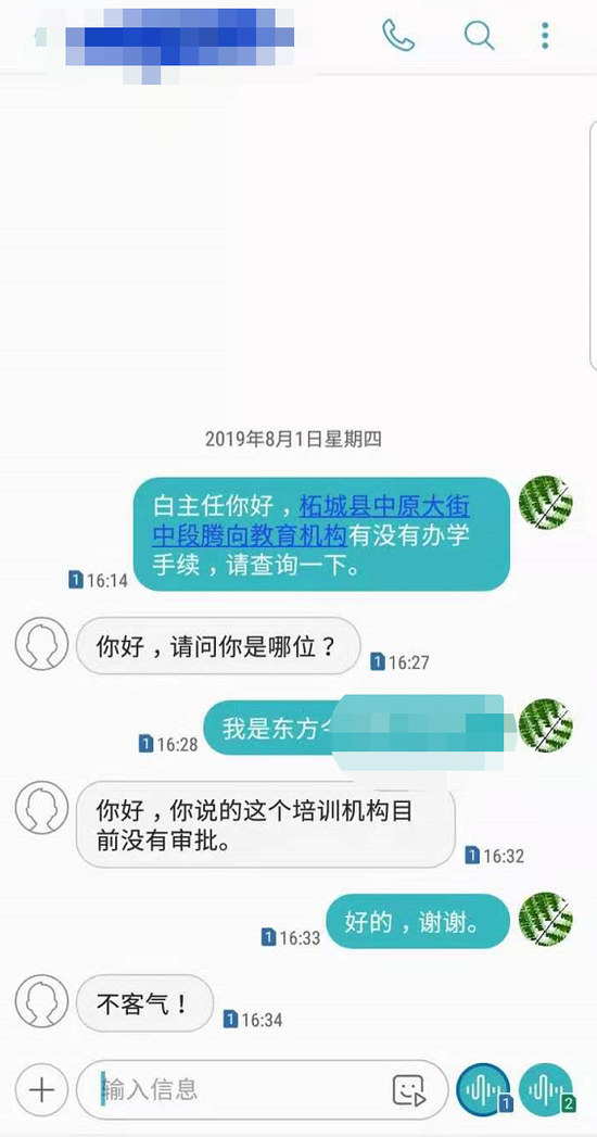 無奈之下,記者又聯系了柘城縣教體局負責校外培訓機構的職成教股負責人白主任關于這所教培機構的情況,白主任以短信回復的形式稱“騰向教育目前沒有審批,無證辦學。”此外,職成教股辦公室一位李姓工作人員說:騰向教育沒有注冊,屬于無證辦學,具體情況待落實后給予回復。