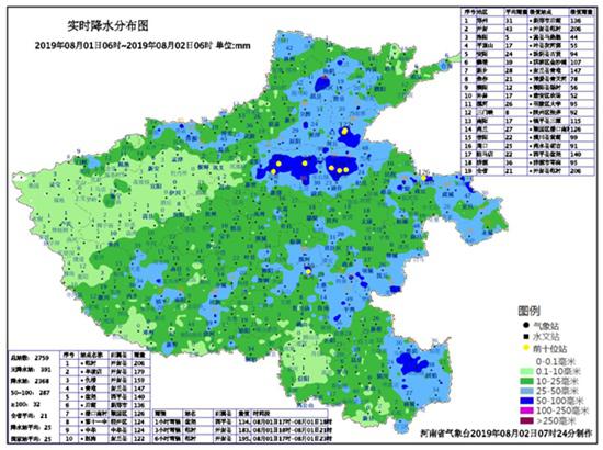 受副高外圍暖濕氣流和低槽切變共同影響,從8月1日06時-2日06時,全省大部出現中雨,京廣線以東出現大雨或暴雨,鄭州、開封兩市出現大暴雨。此次過程雨勢猛、雨強大,鄭州、開封等地強降水的降雨時間多在3~4小時,雨強多在每小時60毫米以上。全省有319個雨量站降水量超過50毫米,32個站降水量超過100毫米,降水量前三位依次為開封縣范村206.5毫米、開封縣半坡店177.7毫米、開封縣仇樓157.6毫米。最大小時雨強出現在西平縣盆堯134.8毫米(1日17時-18時)。