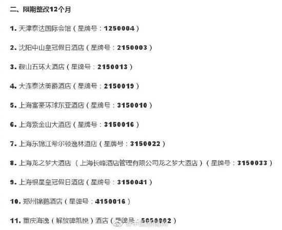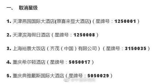 原標題:5家五星級飯店被取消資格,11家被限期整改12個月