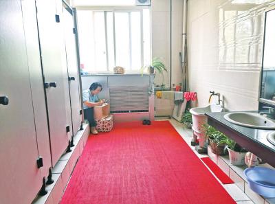 負(fù)責(zé)打掃鄭州黃河科技學(xué)院行政樓三四層區(qū)域包括廁所衛(wèi)生的保潔員是王玉蘭。9月4日中午,經(jīng)該校一位老師指引,記者站在行政樓三樓女公廁門口看到,王玉蘭端坐公廁最里側(cè),一手拿著手機(jī)閱讀文章,一手握著筆俯身趴在小板凳上,不停寫著。其身旁,擺放著掃帚、抹布等保潔工具,公廁地面打掃得干凈,看不出一絲污跡。