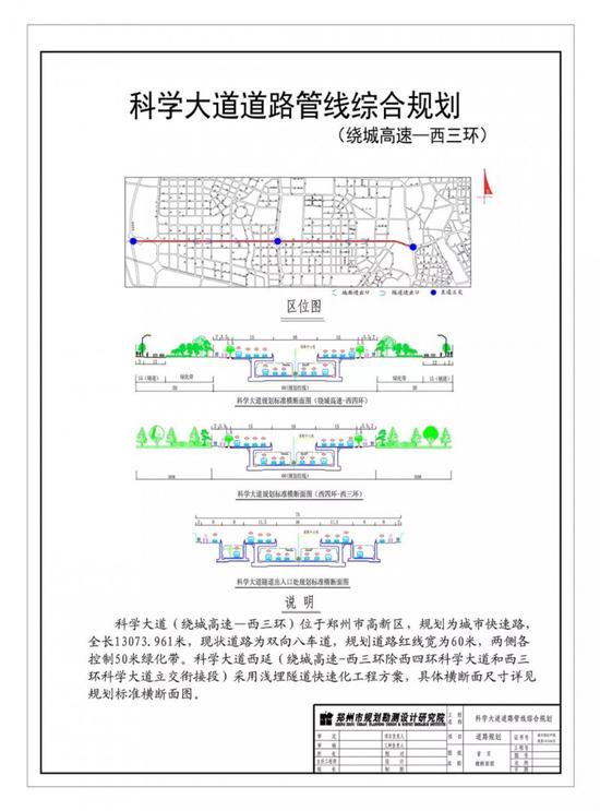 按照規劃,科學大道西三環至繞城高速段全長約13公里,現狀道路為雙向8車道,規劃道路紅線寬度60米,其中地面雙向8車道,隧道雙向6車道,沿線在白松路、瑞達路口東西兩側,設置有雙向隧道出口,在紅松路、長椿路口東側,設置有雙向隧道進口,繞城高速至西四環段還規劃的有兩側輔道。科學大道與西四環、西三環,將通過立交橋進行銜接。