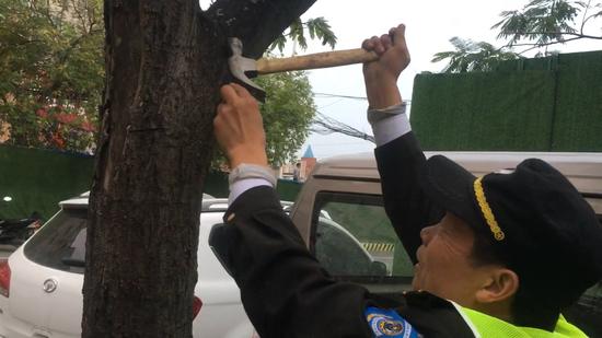 為不影響樹木生長,巡防員隨即找來起釘錘和鐵鉗等工具,將捆綁在樹干上的鐵絲一一剪斷,將大量釘在樹干中鐵釘拔出,為小樹解圍!隨后,大家吃驚的發現,半小時竟然拔出30多顆大釘子。