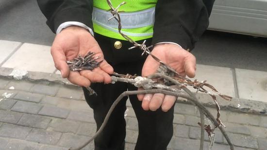 當日,鄭州市金水區巡防隊員接群眾反映后前來查看,果不其然,由于此處道路偏僻,偏僻處幾棵小樹上被人釘上了不少的釘子、鐵絲。由于樹木多年的生長,一些捆綁在樹干上的鐵絲已經深深的陷入樹皮當中,形成一道道凹痕。