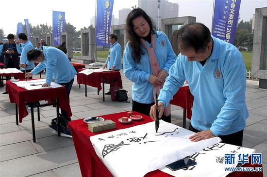 10月18日,書法愛好者在中國文字博物館進行書法創(chuàng)作。新華社記者 李安 攝