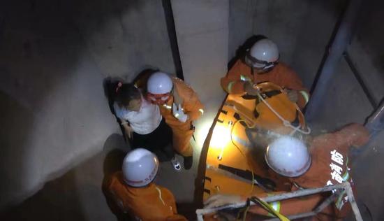 消防員了解得知女子腹部可能遭受撞擊,疼痛難忍,便立即下井施救。首先一名消防員安撫其情緒,同時防止昏迷,然后救援小組利用“三角吊升”繩結(jié)固定救援軟擔(dān)架,因井下操作面積狹小,救援時無法垂直吊升。為防止女子二次受傷,由4名消防員利用梯子從下往上豎直平穩(wěn)的托起擔(dān)架,女子被成功托起至井口,因井口過窄,救援擔(dān)架無法橫向拿出,此時位于井下消防員說:“解開繩結(jié)先給抱出去,我們能頂住,放心”。井上一名消防員立即解開繩結(jié),跪在地上小心翼翼的“公主抱”住女子,在消防員的幫助下站了起來,乘上準(zhǔn)備好的電梯,把受傷女子送向救護(hù)車。經(jīng)120醫(yī)護(hù)人員檢查后表示跌落女子無明顯外傷。