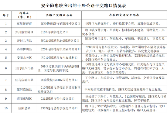 10月23日,省公安廳交警總隊(duì)公布了全省范圍內(nèi)安全隱患較突出的十處公路平交路口,這些路口多存在信號(hào)燈缺失,照明燈、標(biāo)志標(biāo)線不健全等因素,提醒過(guò)往司機(jī)注意減速慢行。
