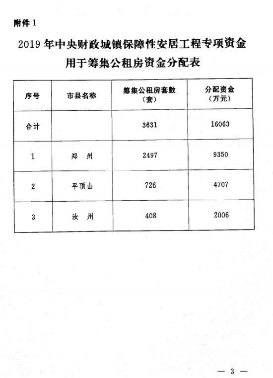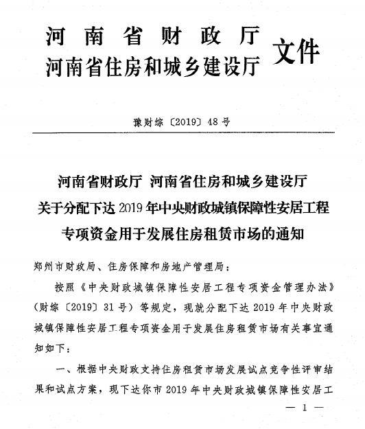 同日,省財政廳、省住建廳還下發了2019年中央財政城鎮保障性安居工程專項資金用于籌集公租房的通知,共分配資金16063萬元,募集公租房3631套。其中鄭州市獲分配資金9350萬元,募集公租房2497套;平頂山市獲分配資金4707萬元,募集公租房726套;汝州市獲分配資金2006萬元,募集公租房408套。