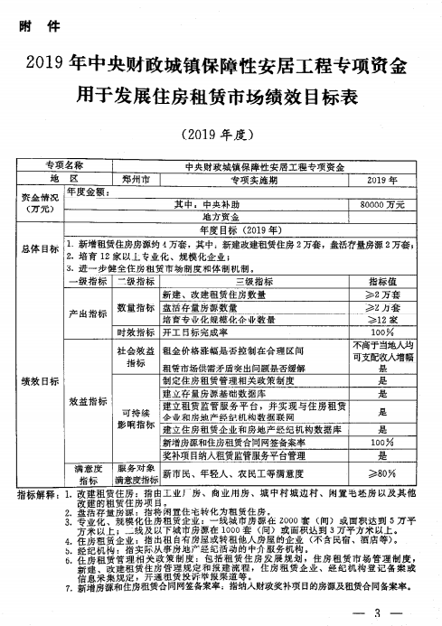 大河財立方消息 11月18日,記者獲悉,河南省財政廳、河南省住建廳發布通知,分配下達2019年中央財政城鎮保障性安居工程專項資金,鄭州市獲8億元專項資金用于發展住房租賃市場。相關績效總體目標提到,將新增住房租賃房源約4萬套,其中新建改建租賃住房2萬套,盤活存量房源2萬套;培育12家專業化、規模化企業;進一步健全住房租賃市場制度和體制機制。