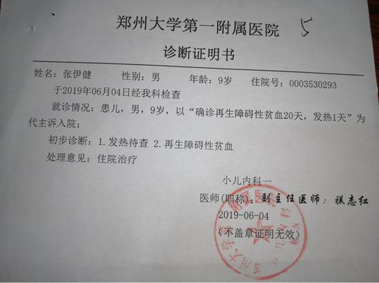 張伊健的笑留在臉上,身體上的疼痛卻不與人訴說。2019年5月8號這個日子和平常一樣,張伊健背著自己的書包去上學,細心的老師發現張伊健精神萎縮臉色蠟黃,老師馬上通知了爺爺張志東。爺爺沒敢耽擱,立刻就帶小伊健去了上蔡縣醫院,抽血檢查后醫生說三系偏低,讓去省里的大醫院檢查。爺爺趕緊和在外地打工的兒子張永博打電話說,小伊健生病了,爸爸張永博也請假往回趕。