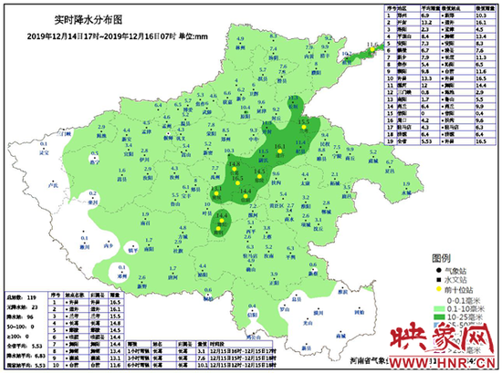 據氣象監測數據顯示,14日17時到今日07時,我省黃淮之間以小雨為主,黃河以北部分地區出現雨夾雪,其中安陽和林州分別出現2.7毫米和1.2毫米的純雪。全省平均降水量5.5毫米,地市平均降水量前三位依次為:許昌13.3毫米、開封13.2毫米、漯河12毫米,國家自動站前三位依次為:許昌16.5毫米、通許16.1毫米、蘭考15.5毫米。