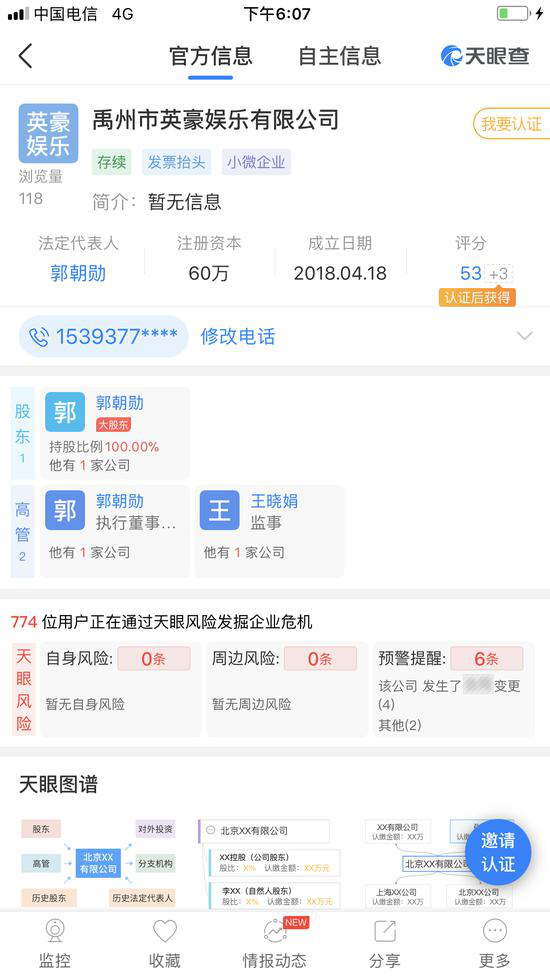 據天眼查,禹州市英豪娛樂有限公司注冊資本600萬元,2018年4月成立,法人姓郭。