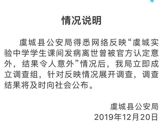 虞城縣公安局得悉網絡反映“虞城實驗中學學生課間發病離世曾被官方認定意外,結果令人意外”情況后,我局立即成立調查組,針對反映情況展開調查,調查結果將及時向社會公布。