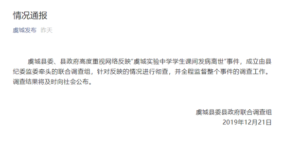 虞城縣委、縣政府高度重視網絡反映“虞城實驗中學學生課間發病離世”事件,成立由縣紀委監委牽頭的聯合調查組,針對反映的情況進行徹查,并全程監督整個事件的調查工作。調查結果將及時向社會公布。