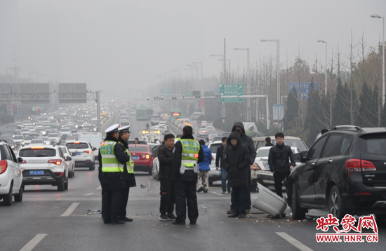 12月24日早上,多名車主在中州大道由南向北通行時,發現特別擁堵。有市民稱,堵了兩三個小時。事故現場可以看到,鄭州中州大道金水立交橋由南向北下橋口出現多車相撞嚴重交通事故,導致該方向交通癱瘓。現場一片狼藉,很多轎車相撞后東倒西歪,損毀嚴重。