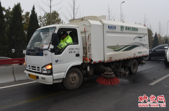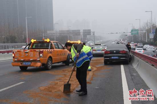 隨后,環衛處的工作人員也開始事故對路面進行處理,用土覆蓋油污,道路交通慢慢恢復。