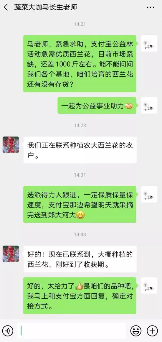 隨后,支付寶方面聯(lián)系了河南農(nóng)業(yè)大學(xué)新媒體指導(dǎo)老師,并由學(xué)校協(xié)調(diào)蔬菜專家、蔬菜基地技術(shù)骨干和農(nóng)戶,在北方貨源本身就十分短缺的情況下全省尋找貨源,最終在駐馬店西平縣一農(nóng)戶大棚中發(fā)現(xiàn)“幸存的”西蘭花1000余斤,支付寶方面當(dāng)即表示訂購(gòu)1000斤。如今,這批農(nóng)大優(yōu)質(zhì)西蘭花已經(jīng)“收割”完畢、整裝待發(fā)!