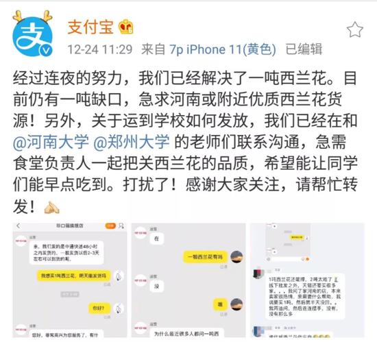 12月24日上午11:29分支付寶官微宣布,向河南求助尋找西蘭花。