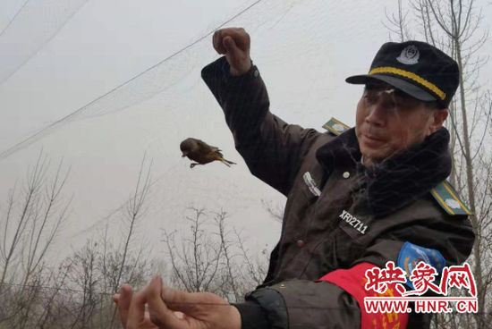 為了不打草驚蛇,巡防員李高學和隊友在附近草叢中蹲守到下午17時左右,一直沒發(fā)現(xiàn)捕鳥人出現(xiàn)。看看天色已晚,為了不讓更多野鳥再度被粘,巡防員在將籠子里的誘鳥和網(wǎng)上被困鳥放飛后,將捕鳥網(wǎng)拆毀。