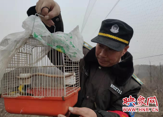 巡防員分析,掛著鳥籠,里面裝著活鳥,應該是捕鳥人有意放置的誘鳥,想通過籠子里的鳥叫引誘附近野鳥前來撞網(wǎng)。