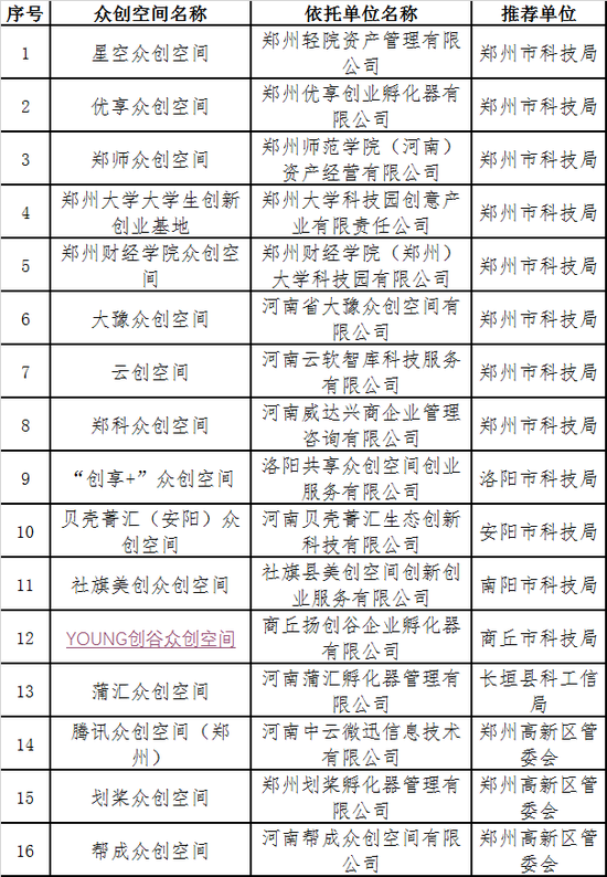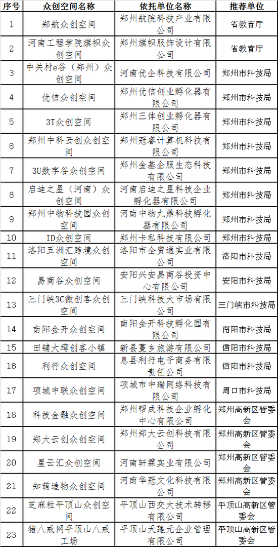 2019年度擬備案河南省眾創(chuàng)空間名單