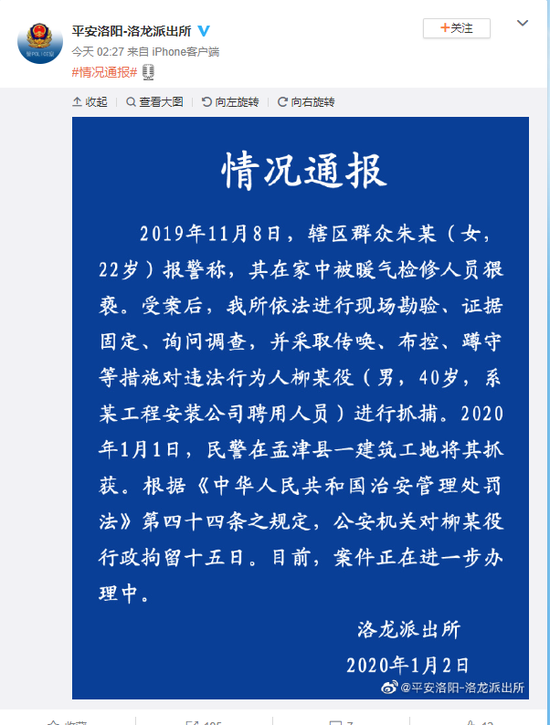 河南省洛陽市公安局洛龍派出所官方微博1月1日通報,去年11月8日,22歲女子報警稱,在家中遭到上門檢修暖氣的工作人員猥褻。1月1日,警方在孟津縣一建筑工地將違法行為人柳某役抓獲。目前,公安機關對該男子行政拘留15日。