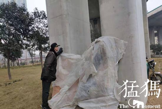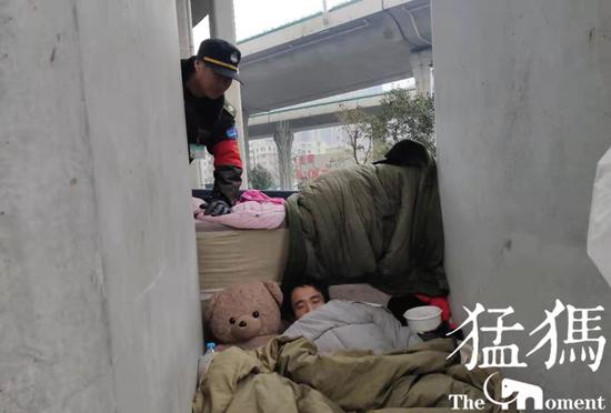 順著環衛工所指的方向,果不其然,隊員看到綠化帶里兩根水泥橋墩之間有一個三輪車和被人搭起的塑料布,走近后發現,兩個橋墩的縫隙間躺著一個蓬頭垢面的男子,男子被窩里還露出一個小女孩兒的腦袋。聽到有動靜后,男子也抬起頭來進行查看。