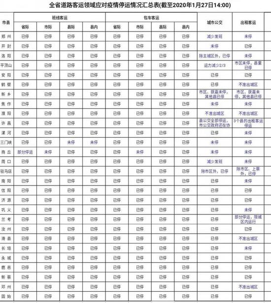 4。平頂山市:1月26日起,市區公交車停班2/3以上,出租車市轄區保留1/3運力,重點保障連接新老城區、醫院等線路,落實好“每日兩次消毒”和“每班次通風”要求。平頂山平運汽車運輸有限公司、華豫運輸服務公司客運分公司所有客運車輛全部停運;舞鋼市平運七分公司所有線路、車輛全部停運;石龍區公交全部停運;葉縣城鄉公交、長途客車全部停運;魯山縣城鄉公交、長短途客車全部停運;郟縣市際班線,城鄉班線,公交車,出租車暫停營運;寶豐縣班線客車全部停運。