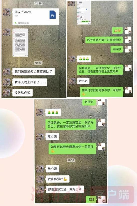 葉璐是洛陽特警支隊一名輔警,妻子孫瑞琳是鄭州大學附屬洛陽市中心醫院護士。在得知單位組建醫療隊準備奔赴武漢前線支援消息后,孫瑞琳主動報名,向醫院申請參戰。而葉璐也一直工作在一線,積極參加執勤巡邏任務,兩人以這種別樣的方式,默默表達對彼此的支持和鼓勵。