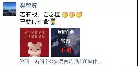 樊智輝是洛陽市公安局古城派出所一名民警,妻子田明輝工作在河南科技大學第一附屬醫院。樊智輝說:疫情在前,醫護不退,警察不退,你我都不退縮!你身穿白衣,在醫院救治病人,我警服上身,維持社會治安。若有戰,召必回!醫警聯手,共筑平安!