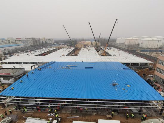 2月1日,被稱為河南版“小湯山醫院”的中建七局鄭州市第一人民醫院傳染病病區項目,箱式板房全部吊裝完成。