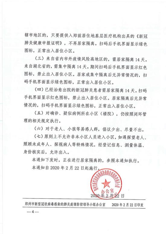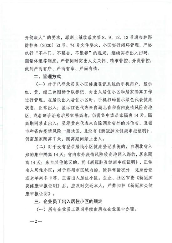 《通知》要求,原則上繼續落實第8、9、12、13號通告和鄭州防控辦(2020)53、74號文件要求,小區實行閉環管理,嚴格執行“不串門、不聚會、不聚餐”的規定,繼續實行出入掃碼、測量體溫等制度。