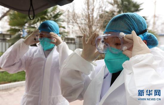 2月26日,在河南省武陟縣疾控中心,崔俊霞(右)和同事田玲俐戴上護(hù)目鏡,準(zhǔn)備取樣工作。