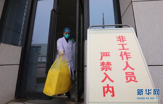2月26日,在河南省武陟縣人民醫(yī)院,崔俊霞(前)和同事攜帶送樣箱從工作人員通道進(jìn)入醫(yī)院感染樓,指導(dǎo)采樣并接收樣本。