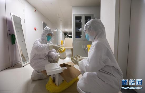 2月26日,在河南省武陟縣人民醫(yī)院感染科,崔俊霞(右)和同事把采樣樣本裝入送樣箱。