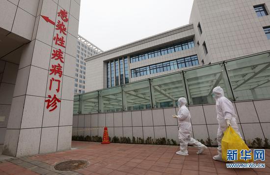 2月26日,在河南省武陟縣人民醫(yī)院感染科,崔俊霞(前)和同事運(yùn)送樣本至市疾控中心。
