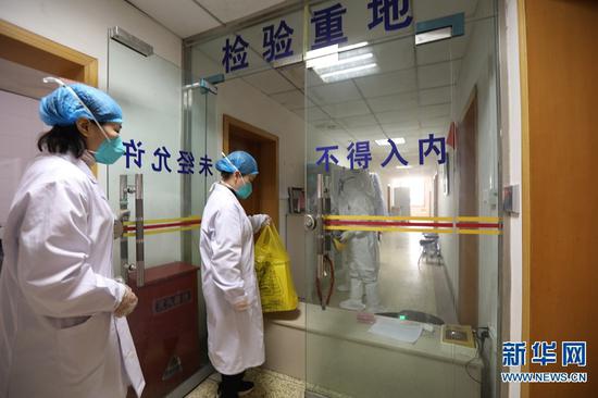 2月26日,在河南省焦作市疾控中心檢驗(yàn)科,崔俊霞(前)與市疾控工作人員進(jìn)行樣本交接。