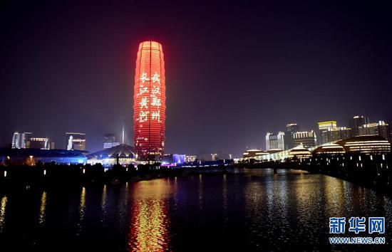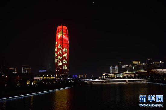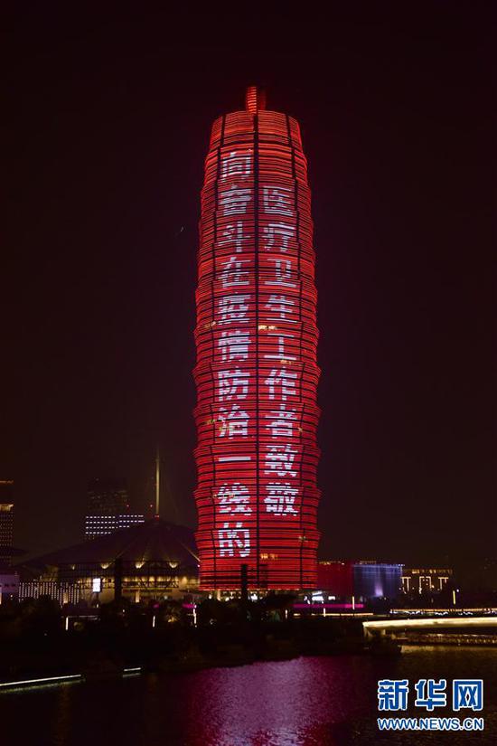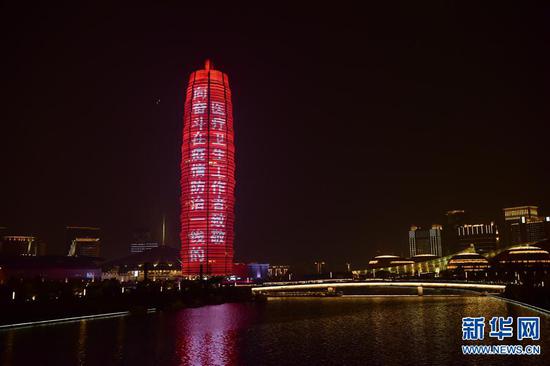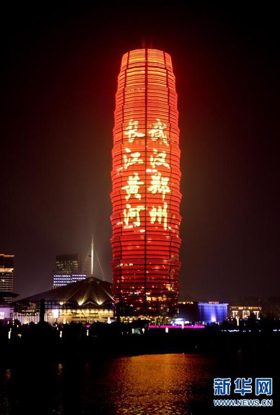 3月21日拍攝的鄭州市千璽廣場燈光秀。 連日來,河南省鄭州市千璽廣場舉行燈光秀,向奮戰在抗疫一線的英雄致敬。 新華社記者 朱祥 攝