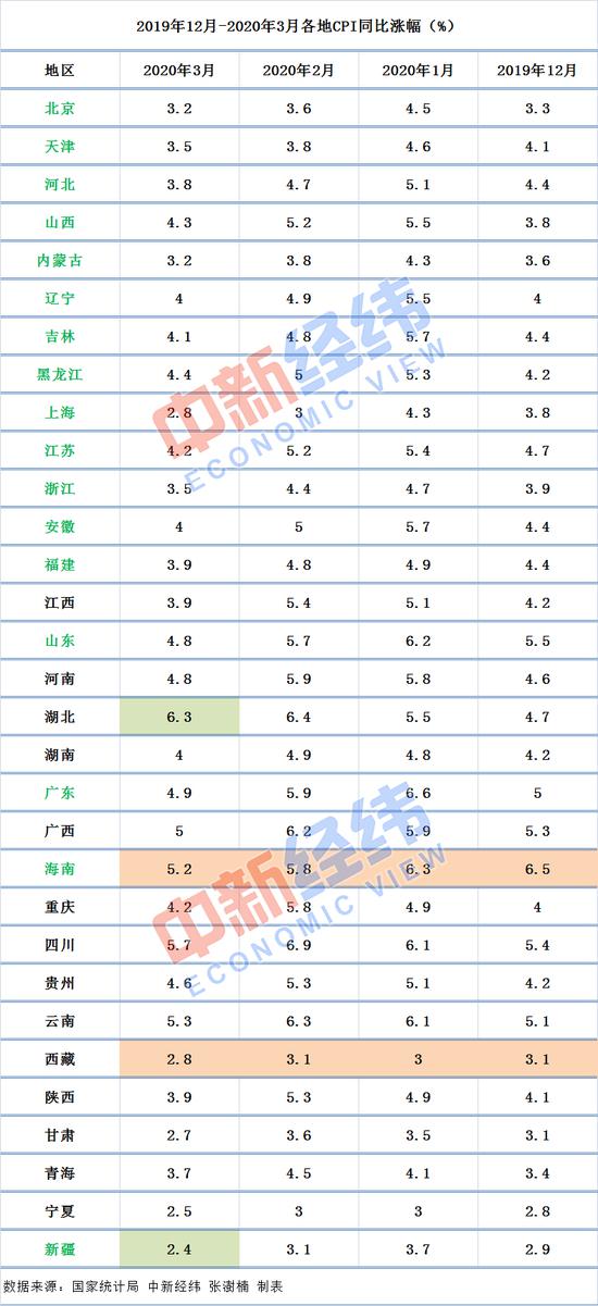 廣西、海南、四川、云南5省份3月CPI同比漲幅“破5”;上海、西藏、甘肅、寧夏、新疆3月份CPI處于“2時代”,新疆同比漲幅最低,為2.4%。
