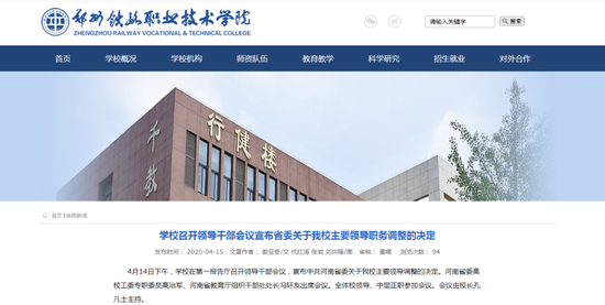 馮軒友宣讀了中共河南省委組織部關(guān)于鄭州鐵路職業(yè)技術(shù)學(xué)院主要領(lǐng)導(dǎo)調(diào)整的決定:許琰同志任鄭州鐵路職業(yè)技術(shù)學(xué)院黨委書記,免去其黃河水利職業(yè)技術(shù)學(xué)院黨委書記職務(wù);蘇東民同志任鄭州輕工業(yè)大學(xué)副校長,免去其鄭州鐵路職業(yè)技術(shù)學(xué)院黨委書記職務(wù)。