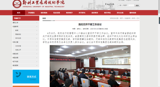 4月15日,鄭州工業(yè)應(yīng)用技術(shù)學(xué)院在行政管理中心六樓會議室召開干部工作會議,宣布中共河南省委組織部關(guān)于鄭州工業(yè)應(yīng)用技術(shù)學(xué)院主要領(lǐng)導(dǎo)的任免決定。省委高校工委專職委員高治軍、組織干部處處長馮軒友出席會議,中原華信商貿(mào)集團(tuán)總裁、學(xué)校副理事長徐朝陽,河南華信陽光教育科技集團(tuán)總經(jīng)理閆兵、學(xué)校全體校領(lǐng)導(dǎo)及各單位負(fù)責(zé)人參加會議。會議由中原華信集團(tuán)總裁徐朝陽主持。