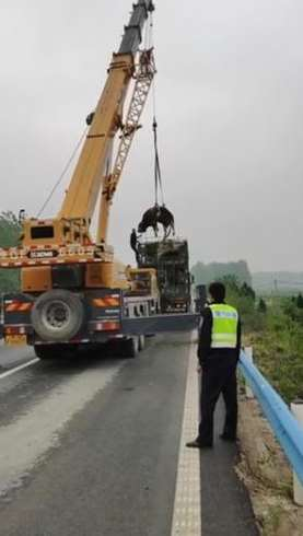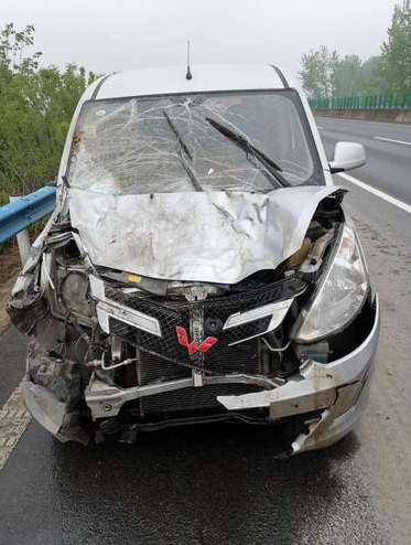 二十多分鐘以后,又接到群眾報警:自己在大廣高速2171公里處撞到一頭在高速路上亂沖亂跑的牛,車輛受損嚴重無法繼續行駛。