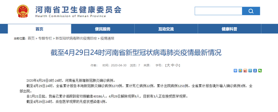 2020年4月29日0時-24時,河南省無新增新冠肺炎確診病例。
