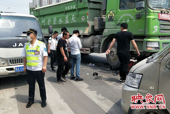 據現場的金水巡防隊員魯建國講,電動車基本報廢,女子大概四十歲左右。當時,路面車流量大,造成短暫擁堵。巡防隊員及時疏導交通,疏散行人,防止出現次生事故。