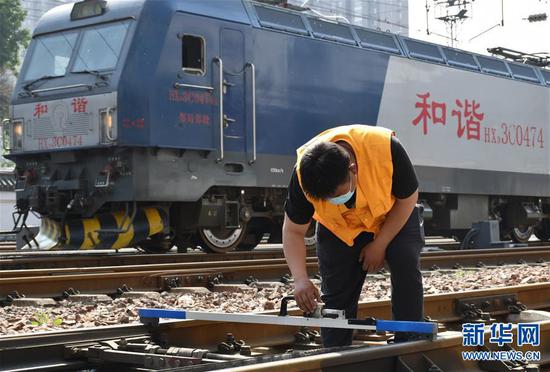 4月30日,鐵路職工李佳晨在鄭州車站南岔區(qū)進(jìn)行線路檢查,測量軌距和線路是否平直。 4月30日上午,中國鐵路鄭州局集團(tuán)有限公司鄭州橋工段鐵路職工利用“五一”假期前列車的“天窗時間”,進(jìn)行鐵路線路檢測及維護(hù),以保障假期鐵路運(yùn)行安全。 新華社記者孫清清攝