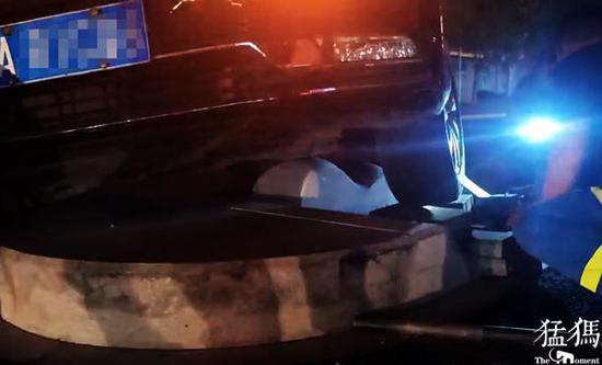 據隊員了解,當時駕車的是一名女司機,由于在左拐時沒看清路口新修的“安全島”路牙石,結果一個沖撞后,車輪被架空。