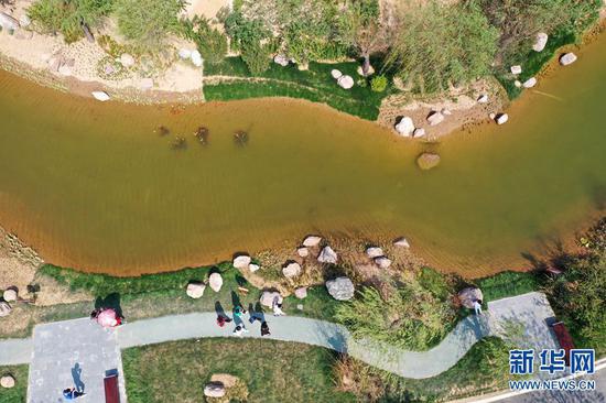 5月1日,游客在河南省鶴壁市淇濱區鉅橋鎮崗坡村的水系旁游玩(無人機照片)。