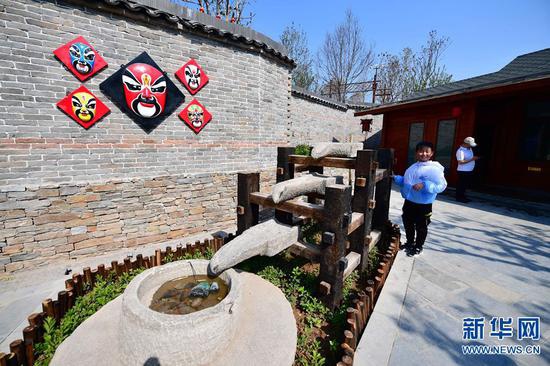 5月1日,游客在河南省鶴壁市淇濱區鉅橋鎮崗坡村的水系旁游玩。