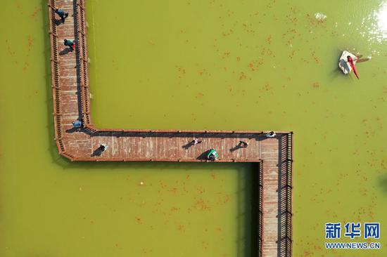 5月1日,游客在河南省鶴壁市淇濱區鉅橋鎮崗坡村棧橋上游玩(無人機照片)。