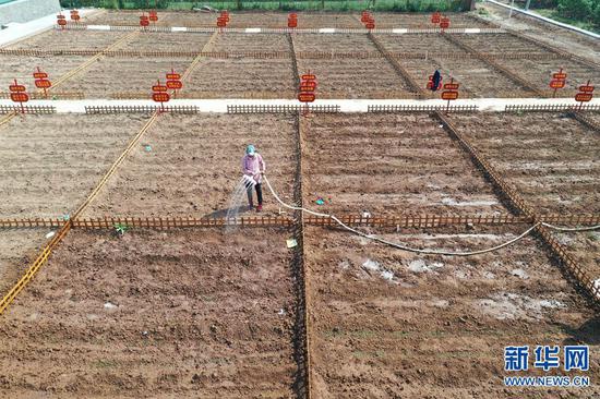 5月1日,村民在河南省鶴壁市淇濱區鉅橋鎮崗坡村共享菜園里澆水(無人機照片)。