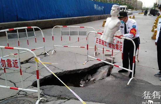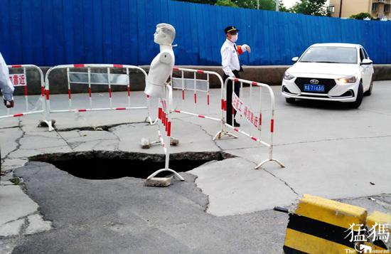 據隊員宋建軍稱,快車道塌方是在凌晨被發現的,當時燈光昏暗,也看不到洞下的情況,他們只有先在旁邊守候著,防止經過的電動車或汽車陷進去。天亮后,他們從塌方處向下查看,發現洞口周圍的路面僅剩下一層薄薄的水泥,布滿了裂痕,且下面竟全是空洞。別說車從上面壓過,就是人站上去,都可能踩塌。直至天亮,守候的隊員才從附近找來施工用的圍欄,并綁上警示標志。